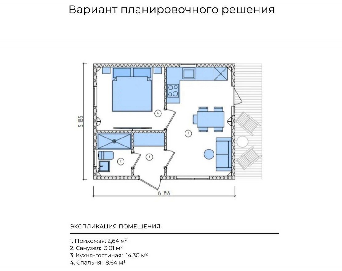 Высокие окна наполняют комнаты естественным светом, визуально расширяя пространство и создавая ощущение свободы. Этот компактный и экономичный вариант идеально подходит для отдыха семьи из 2 или 4-х человек. Уютная веранда станет прекрасным местом для утреннего кофе, вечерних бесед или созерцания звёздного неба.